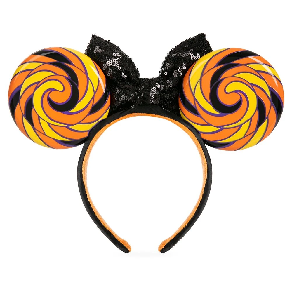 You won’t need tricks to look like a treat in this ”Sweet and Spooky” Minnie Mouse Halloween headband with black sequined bow and lollipop ears.