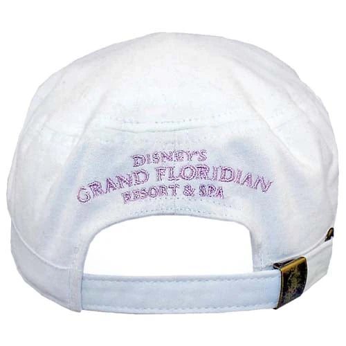 This white military cap has beautiful silver embroidery in a floral design with the Grand Floridian logo in silver thread, highlighted in pink thread. Rhinestone accents add the perfect touch.