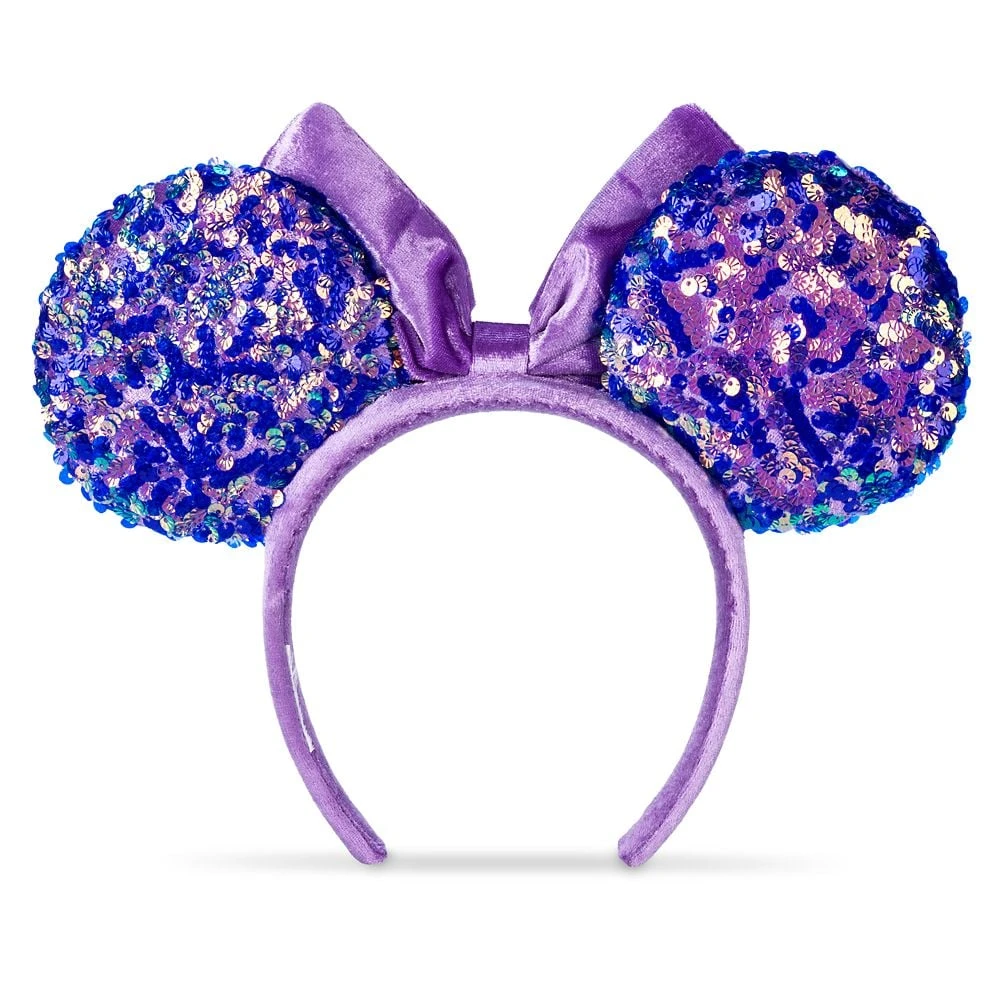 Like Minnie Mouse, you’ll be a timeless classic in this amethyst-colored velour ear headband and bow with sequin ears.
