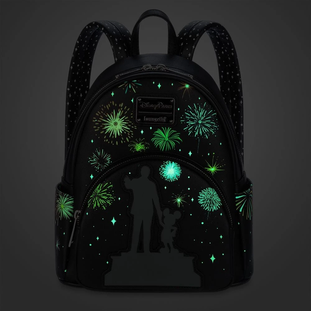 Carry the thrill and excitement of the Disney100 Platinum Celebration Finale with you always with this simulated leather mini backpack from Loungefly. Featuring an appliquéd silhouette of the iconic Walt Disney and Mickey Mouse ”Partners” statue on the front amid colorful screen art of fireworks bursting all around. Glow-in-the-dark and light-up accents make it all the more magical.