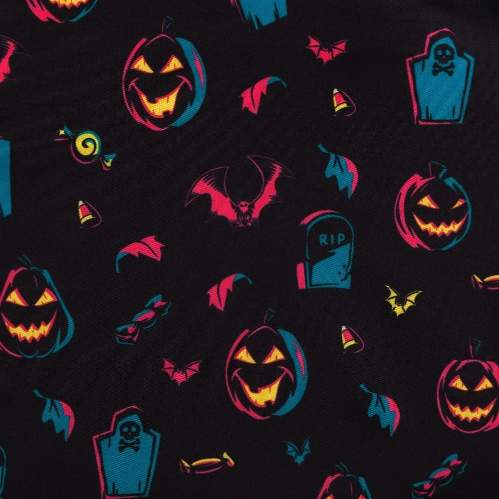 - Lining features allover Halloween print with bats, pumpkins, tombstones and autumn leaves